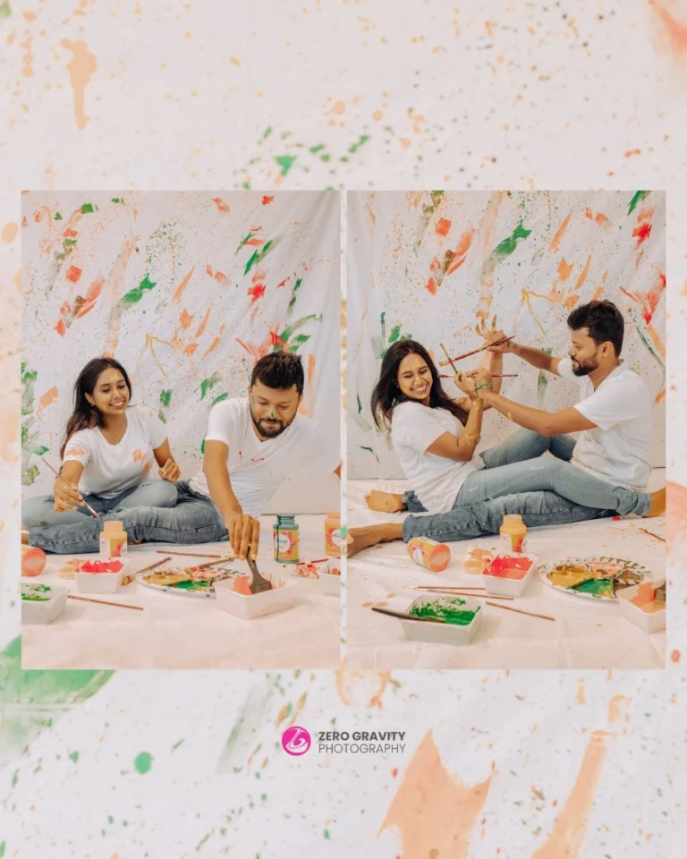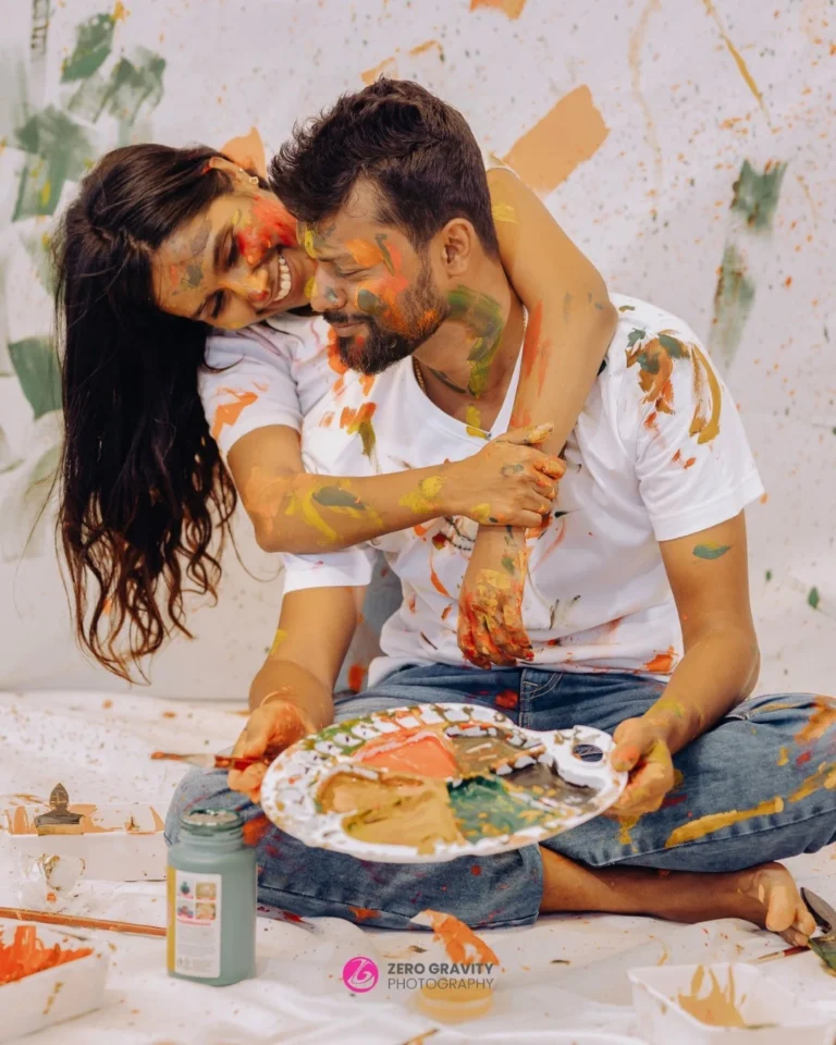 Props and accessories can enhance the visual appeal of your paint-filled photoshoot. Consider using items such as paintbrushes, buckets of paint, or even water balloons filled with paint for a fun twist. The couple can wear plain white outfits that will showcase the paint splatters beautifully, highlighting the contrast and vibrancy of the colors. Incorporating props like large canvases, easels, or colorful umbrellas can also add layers to the narrative of the photoshoot, making the images more engaging and storytelling.